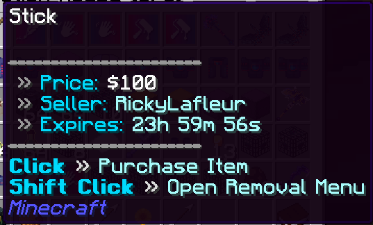 In this example, it shows what is on sale with the details of the lore. It shows who the seller is, what the price is, and when the item expires.&#x20;